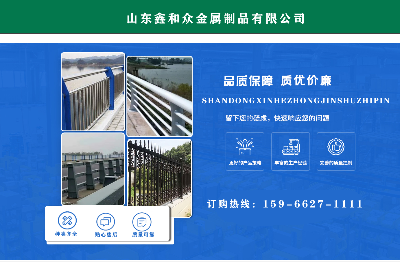 山東鑫和眾金屬制品有限公司主要產(chǎn)品有防撞護欄,橋梁護欄,道路護欄,河道護欄,不銹鋼護欄等護欄。提供設計方案,一站式定制,包您滿意價格優(yōu)惠,歡迎來電咨詢! 公司常年從事銷售護欄防撞護欄,橋梁護欄,道路護欄,河道護欄,不銹鋼護欄,橋梁鋼護欄,河道燈光護欄等。產(chǎn)品廣泛應用于橋梁、河道、旅游景區(qū)、道路、公路、公園、小區(qū)、景觀、道路防撞等領域。 公司產(chǎn)品均采用優(yōu)質(zhì)不銹鋼材料,符合相關(guān)標準。各種型號不銹鋼復合管及護欄,質(zhì)量嚴格把控。產(chǎn)品強度高、耐腐蝕、焊接牢固、抗沖擊、性能好,防撞護欄結(jié)構(gòu)簡單、美觀實用大方。 歡迎前來訂購!...